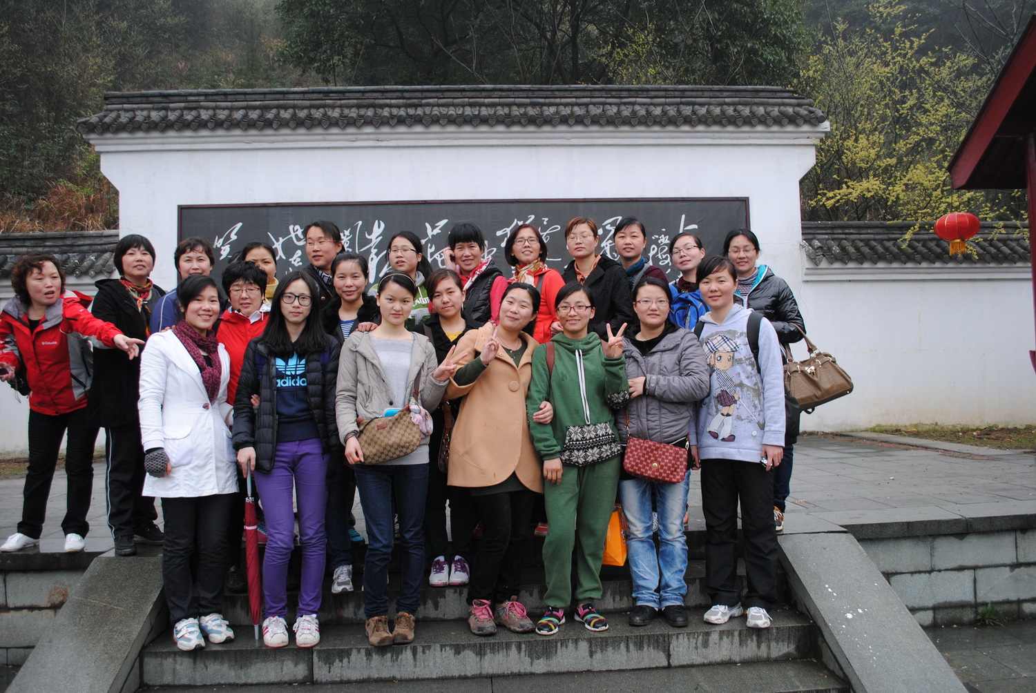 那天,天氣時而陰柔時而細雨飄零,恰是別有一番韻味,一切都在朦朦朧朧中。女同志們乘著早晨的霧氣直奔九峰之巔,一路上風景煞是秀麗,參天大樹,直入云霄,青山綠水,綠意盎然,放眼遠處群山,如詩如畫。經過半個多小時的攀登,終于到達峰頂,好一句杜甫的“會當臨絕頂,一覽眾山小”,山下的房屋、村落、溪流都顯得如此渺小。